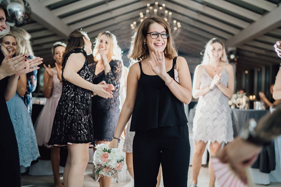 Ein weiteres Highlight des Abends ist der Wurf des Brautstraußes. Dieser ist sehr begehrt bei zweien der unverheirateten Damen. Doch am Ende freut sich eine Dritte.